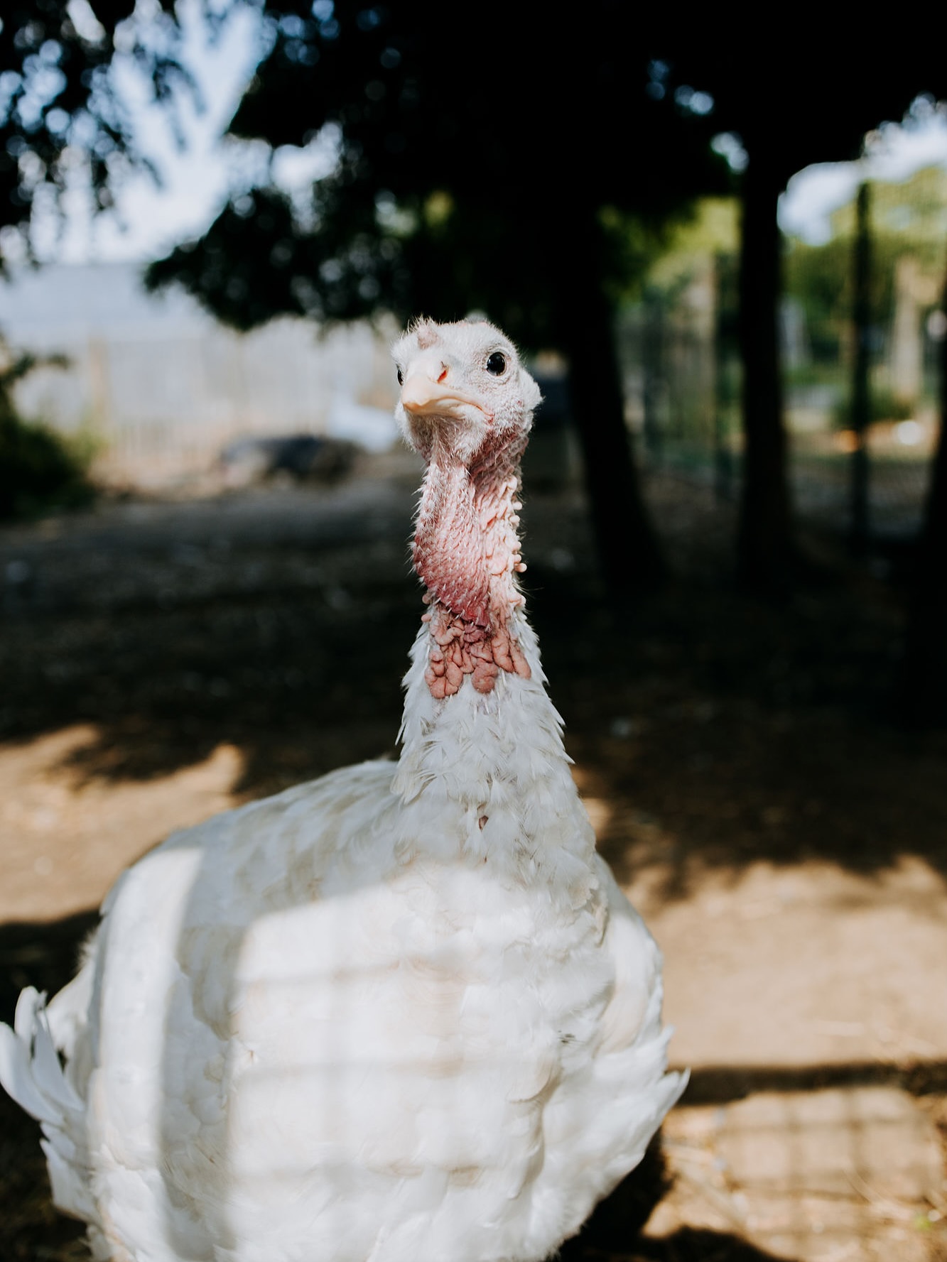 Deze witte kalkoen kwam via een verplichte afstand bij ons terecht. Ze was helemaal alleen, maar vond al snel gezelschap bij onze kip Houdini…